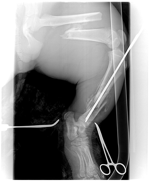 By day 14 our veterinarian felt he was strong enough to set his leg. Both large bones in his left hind leg were badly broken (see pictures above). The operation took almost five hours. She put rods through the center of the bones. It was a very big job, but everything went well.