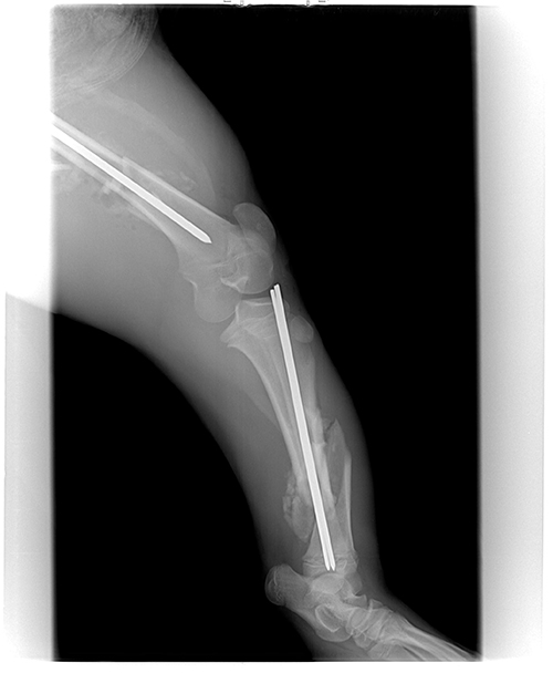 On Jan. 1, 2013, Frank’s veterinarian X-rayed his leg again to see if it had healed properly and to see if the rods needed to be removed. She was very happy with how the leg had healed. She needed to remove only one of the rods. Frank now had only 30 days more to heal from having the rod removed and then he would be able to move in with the girls.