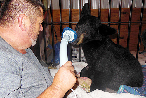 By the ninth day he had a good appetite. He was able to hold his head up to eat chicken hearts and livers, which was his favorite food at that time. I put my finger in his ear (bears hate that) and he was able to shake his head. The following day our veterinarian began laser therapy on him. His badly broken leg was still not set. She felt he was not strong enough to be put under anesthesia.